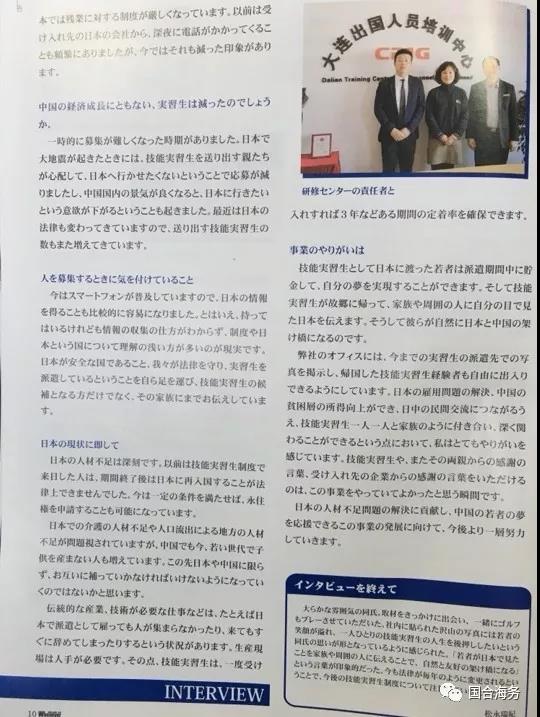 國合海務總經理高毅接受漫步雜志社專訪 2020-09-04 1745 2019年6月,我司總經理高毅先生接受大連著名的漫步雜志社記者專訪。 大連漫步雜志是一本日語綜合月刊雜志,旨在為居住在大連的日本人和日本旅客、在大連進行商務洽談的日本企業以及關注日本資訊的中國人提供有益信息。 在專訪中,總經理高毅對技能實習生制度的現狀及將來的發展趨勢進行了深度的剖析和解讀。表示今后會繼續用心經營技能實習事業,培養更多優秀人才,使他們成為中日兩國的友好橋梁。